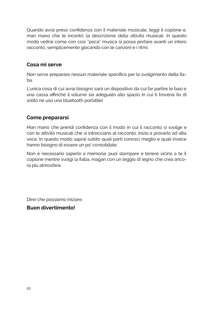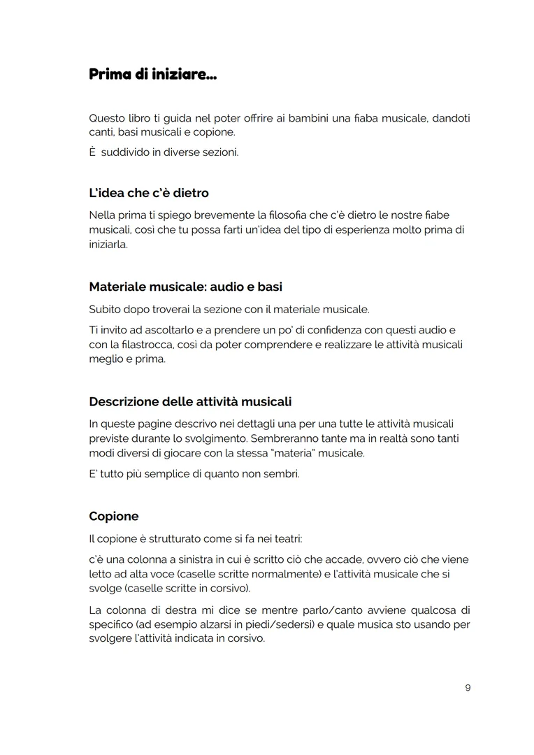 - un pdf con: il copione, i testi del canto e della filastrocca, la descrizione passo passo delle attività musicali e di come proporle